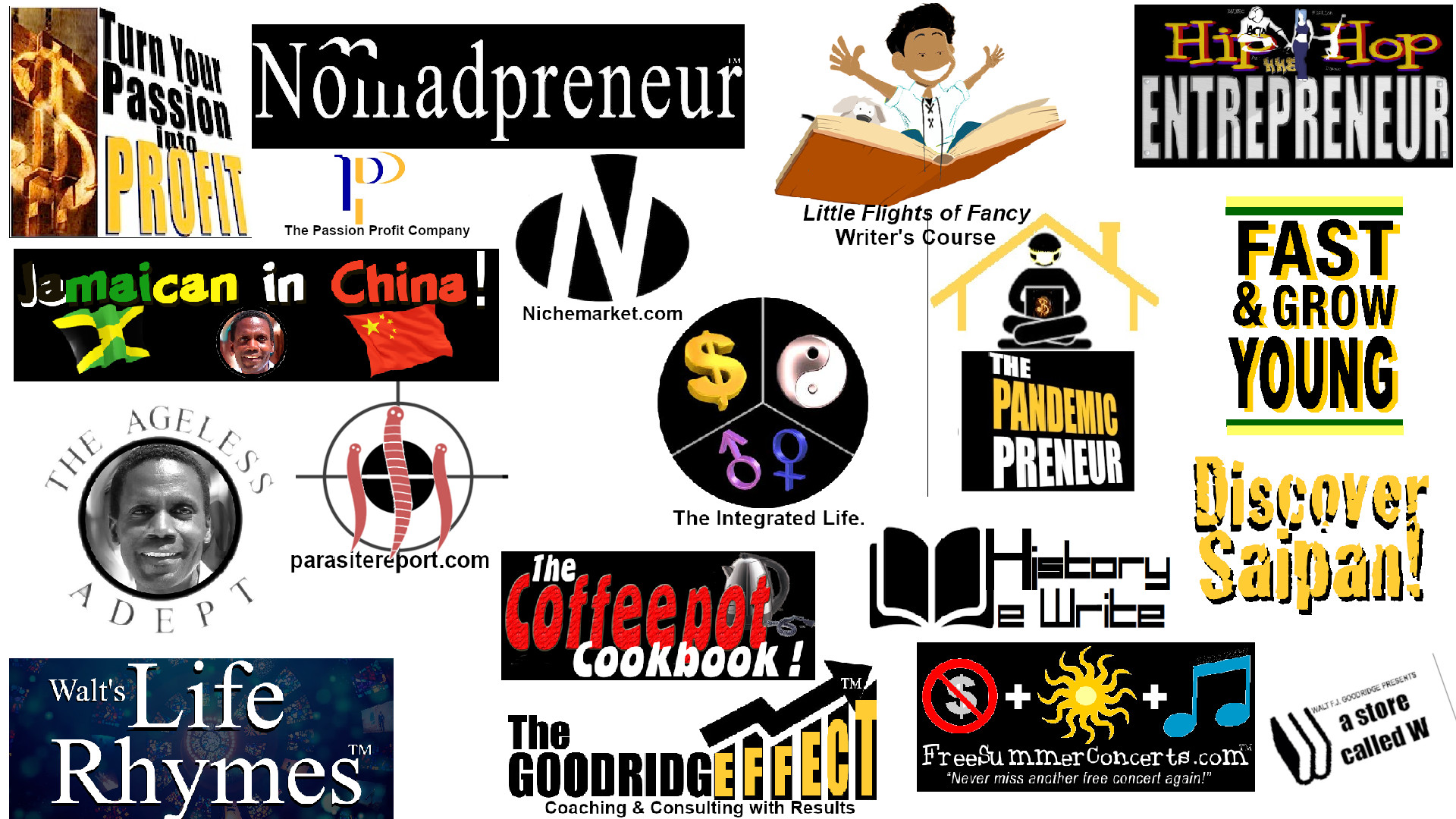Hi! My name is Walt F.J. Goodridge, former frustrated employee, now "nomadpreneur" author of Turn Your Passion Into Profit as well as A Clean Cell Never Dies, Fit to Breed and the Loving True™ series of books. My personal life mission statement is: " I share what I know so that others may grow!" I help people break free from limiting belief systems in order to discover, develop and profit from their passions, transform themselves physically, and master their relationships so they can live true to themselves and experience a life of freedom, function, fitness and fun! I believe that's what life is all about: the FREEDOM to live life on your terms, fulfulling your FUNCTION (purpose), maintaining physical FITNESS to live free of illness, and having a whole lot of FUN doing it! It's all part of a philosophy I call "the Integrated Life."